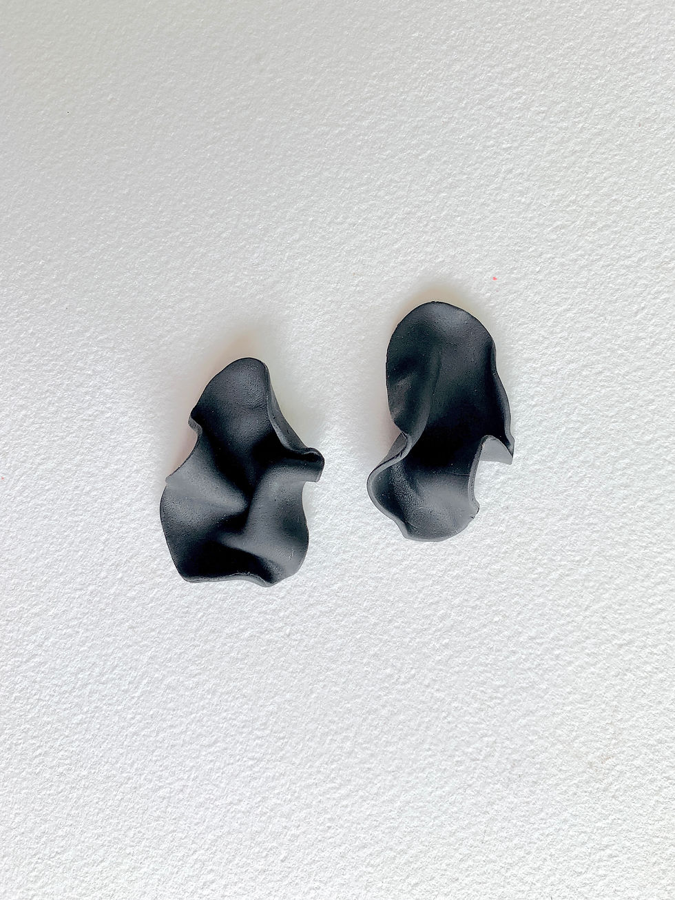 : Peças moldadas à mão em formatos soltos que lembram ondas. Feitas em polímero, um material resistente e levemente maleável.